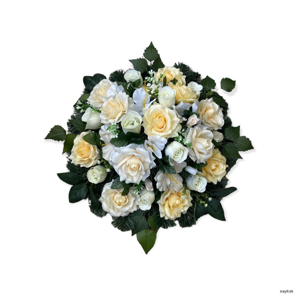 Umelý smútočný veniec okrúhly s priemerom 50cm. Do poznámky je potrebné uviesť text na stuhu.